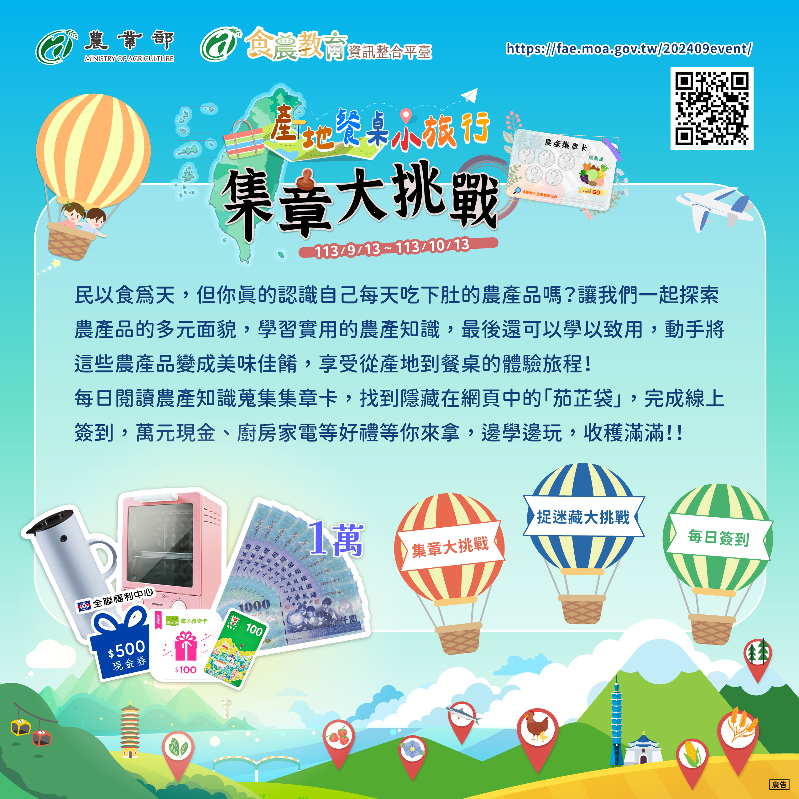 一、農業部食農教育資訊整合平臺預訂於113年9月13日至10月13 日辦理「產地到餐桌小旅行 集章大挑戰」食農教育推廣 活動。