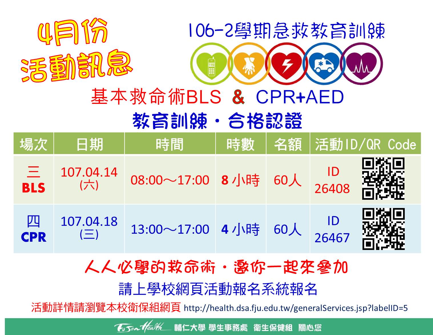 活動請至本校活動管理系統報名(期別ID 26352、26353),活動詳情請瀏覽本校衛保組網頁。(迄107.03.15截止報名) http://health.dsa.fju.edu.tw/generalServices.jsp?labelID=5